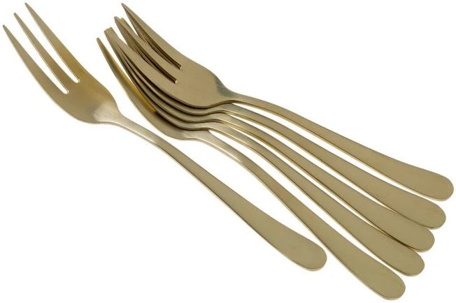 El color champán de estos tenedores de repostería Amefa Austin 1410 los hace parecer muy modernos. Están fabricados en acero inoxidable 18/0 y mejorados con un fino revestimiento de PVD de titanio. La longitud de estos tenedores de pastelería es de 14 cm.