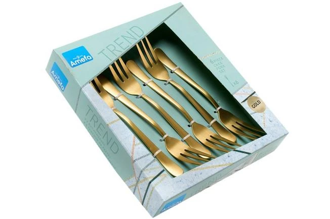 Hazte notar con estos tenedores de pastelería dorados. Fabricados en acero inoxidable 18/0 con un fino revestimiento de titanio PVD (Physical Vapor Deposition).