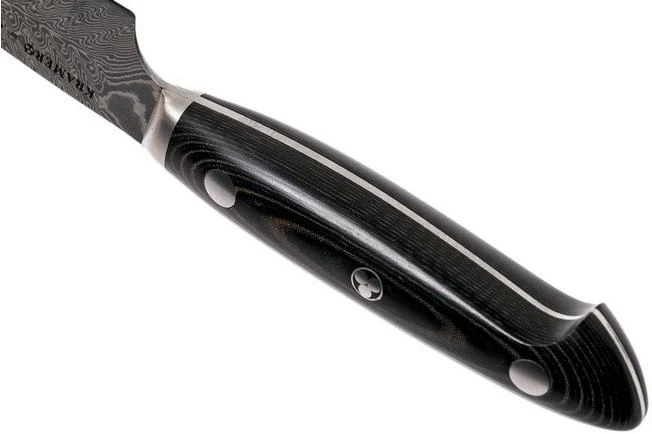 El cuchillo universal Bob Kramer by Zwilling Euro Stainless, 13 cm tiene una hoja fina y larga y puede utilizarse para diversos trabajos de corte. La hoja tiene una ligera curva que termina en punta. De esta forma, puedes hacer balancear el cuchillo para picar hierbas. Se utiliza la punta para los trabajos más detallados. Todo lo que no se puede hacer con un cuchillo de chef porque es demasiado grande, se puede hacer con este cuchillo universal. Ya sea para cortar queso, salchichas o picar finamente las hierbas.