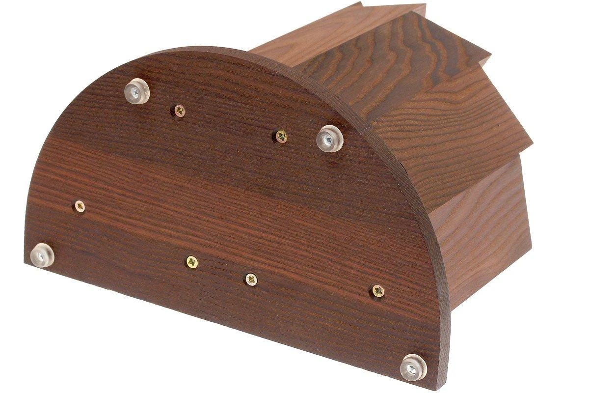 El bloque de cuchillos magnético Böker Makassar ofrece espacio para hasta 7 cuchillos. El diseño del bloque es muy adecuado para su colocación contra una pared. Con un cuchillo en el interior del bloque y seis espacios en el exterior, es una opción elegante para guardar tus cuchillos. En cuanto al material, Böker ha elegido la madera de fresno quemada. Esto hace que el bloque tenga un fuerte olor a carbón. Para los cuchillos grandes con una longitud de hoja de hasta 23,5 cm hay dos espacios en este bloque de cuchillos. Con pequeños escalones de 2 cm, el tamaño desciende hasta 13,5 cm en la parte más baja.