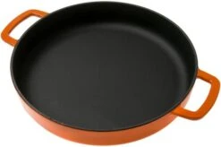 Esta sartén Combekk Sous Chef naranja tiene un diámetro de 28 cm. La sartén, incluidas las dos mangos, está completamente hecha de hierro fundido 100% reciclado. Está mejorado con un revestimiento de esmalte y no contiene PFAS, PFOA ni PTFE.