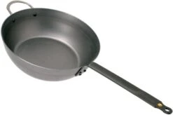 Esta sartén wok Mineral B Element de Buyer de 32 cm es una sartén especial a un precio muy razonable. Está hecha de acero al carbono. Un tipo de acero que no es inoxidable. Eso puede parecer un inconveniente, pero puede funcionar como una ventaja si se utiliza con cuidado. La sartén es sólida y pesada. No tiene revestimiento antiadherente, pero se formará uno automáticamente al utilizar la sartén. Debido a que las sartenes no tienen un revestimiento antiadherente, pueden cocinar a temperaturas muy altas. Además, puedes utilizar utensilios de cocina de acero sin preocuparte de dañar el revestimiento antiadherente. Estas sartenes Mineral B Element tienen una fina capa de cera de abeja en la superficie de cocción en el momento de la entrega. Esto reduce significativamente la posibilidad de corrosión en el momento de la entrega. También ayuda a aromatizar la sartén, por lo que la sartén es ligeramente más antiadherente desde el principio, que la serie Acier Carbone normal. Se puede utilizar en todas las placas de cocción. Incluyendo la inducción, e incluso se puede utilizar en el horno. Ten en cuenta que el mango de esta sartén se calienta. Lava esta sartén sólo con agua caliente y un cepillo. El jabón está completamente descartado y el lavavajillas causará un daño irreparable a la sartén. Estas sartenes necesitan un tratamiento especial, pero cuando se usan correctamente, es un placer trabajar con ellas.