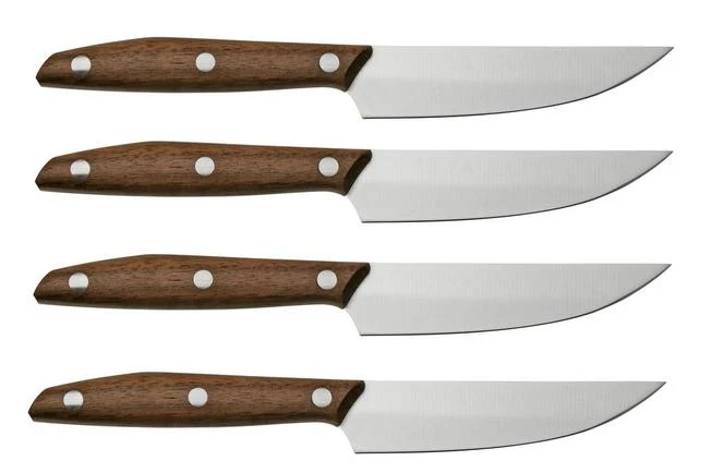 El Due Cigni 1896 America Juego de cuchillos de carne de 4 piezas de madera de nogal es un llamativo y elegante juego de cuatro cuchillos de carne. Los cuchillos para carne son indispensables para los verdaderos amantes de la carne. Cortan filetes u otros trozos de carne sin desgarrarlos. Además, un elegante cuchillo para carne será la pieza central de tu mesa y una excelente manera de impresionar a tus invitados. El juego viene en una caja de madera para guardarlo.