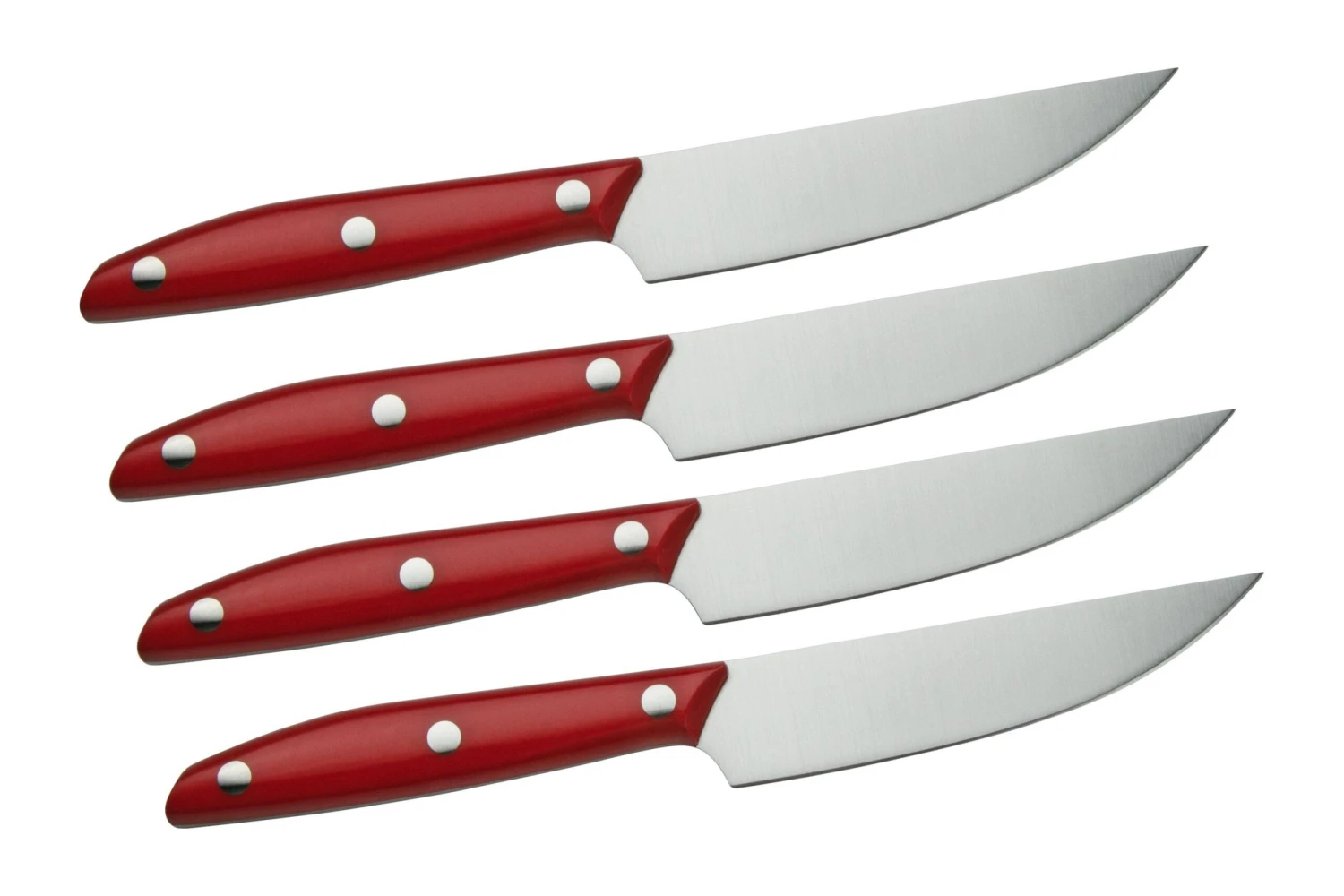 El Due Cigni 1896 America Juego de cuchillos para carne de 4 piezas rojo es un llamativo y elegante juego de cuatro cuchillos para carne. Los cuchillos para carne son indispensables para los verdaderos amantes de la carne. Cortan filetes u otros trozos de carne sin desgarrarlos. Además, un elegante cuchillo para carne será la pieza central de tu mesa y una excelente manera de impresionar a tus invitados. El juego viene en una caja de madera para guardarlo.