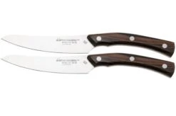 Este Due Cigni 2C910ZW es un juego de 2 cuchillos para carne. No son demasiado grandes, pero tampoco pasan desapercibidos en la mesa. La notable forma de la hoja y el mango curvado (para evitar el cansancio) hacen que este cuchillo sea único. No es de extrañar si se tiene en cuenta que los cuchillos de esta colección han sido diseñados por el cuchillero danés Jens Ansø. Como es habitual en los diseños de Ansø, la perfección y la funcionalidad son la clave. Se nota cuando se mira el cuchillo.