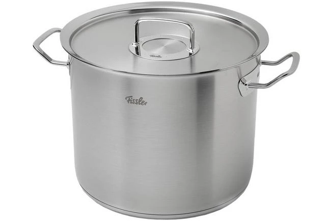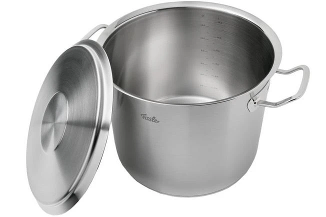 Esta olla grande de la colección Fissler Original Profi de 28 cm tiene un borde extra alto de 23 cm. El contenido de la olla es de 14 litros, la capacidad del interior es de 12 litros.