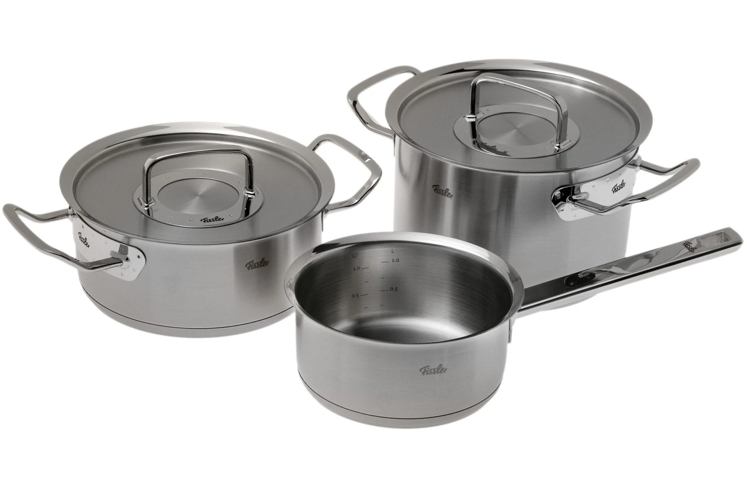 Este juego de sartenes Fissler Original Profi Collection se compone de tres partes: una olla, una cacerola y una sartén. La olla y la cacerola están realzadas con una tapa. Contenido de este juego:
