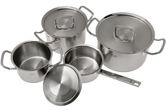 Este sistema de cacerolas Fissler Original Profi Collection de 4 piezas se compone de 3 ollas y 1 sartén. Las ollas vienen todas con tapa. Contenido de este juego: