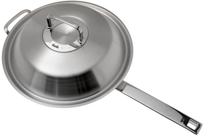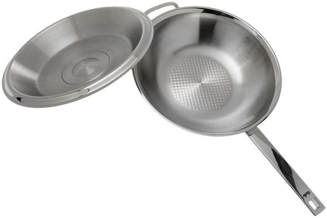 La Fissler Original Profi Collection Wok tiene un diámetro de 30 cm. Viene con una tapa alta. El wok tiene un contenido de 4,1 litros y la capacidad del interior de la sartén es de 2 litros.