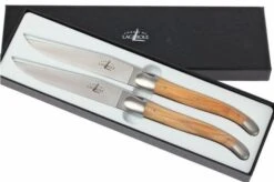 Este juego de cuchillos de mesa de Forge de Laguiole consta de dos hermosos cuchillos hechos a mano. Las hojas tienen un núcleo de acero inoxidable francés que está muy afilado y conserva su filo durante mucho tiempo. Los mangos de madera de olivo irradian lujo y están equipados con la característica cruz de pastor en forma de siete remaches. Por supuesto, la abejita típica de Laguiole también se encuentra en el reverso de las hojas.