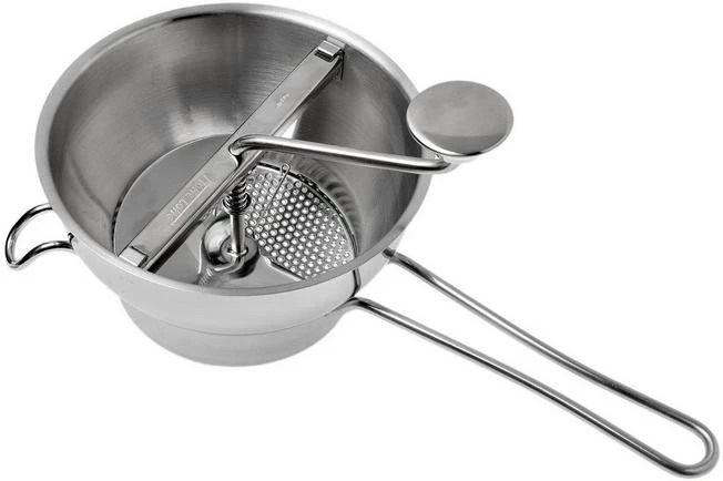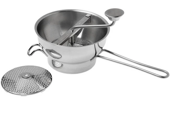 Con un passe-vite, también llamado pasapurés, puedes moler y triturar alimentos semiduros. En un momento puedes hacer mermelada, compota, salsa, sopa y puré. La Flotte Lotte de Gefu viene con diferentes discos para procesar frutas y verduras de muchas maneras diferentes. Además, se incluye un disco rallador de 2 mm que puedes utilizar para rallar puerros, espárragos y otras verduras. Además, este práctico aparato viene con un disco de 3 mm para hacer puré de verduras y frutas y convertirlas en compotas. Una rasqueta gira en el bol y evita la acumulación de alimentos en los lados. De este modo, el producto en el passe-vite se pica uniformemente. El bol de 2 litros es de acero inoxidable y todas las piezas pueden limpiarse después a mano o en el lavavajillas.