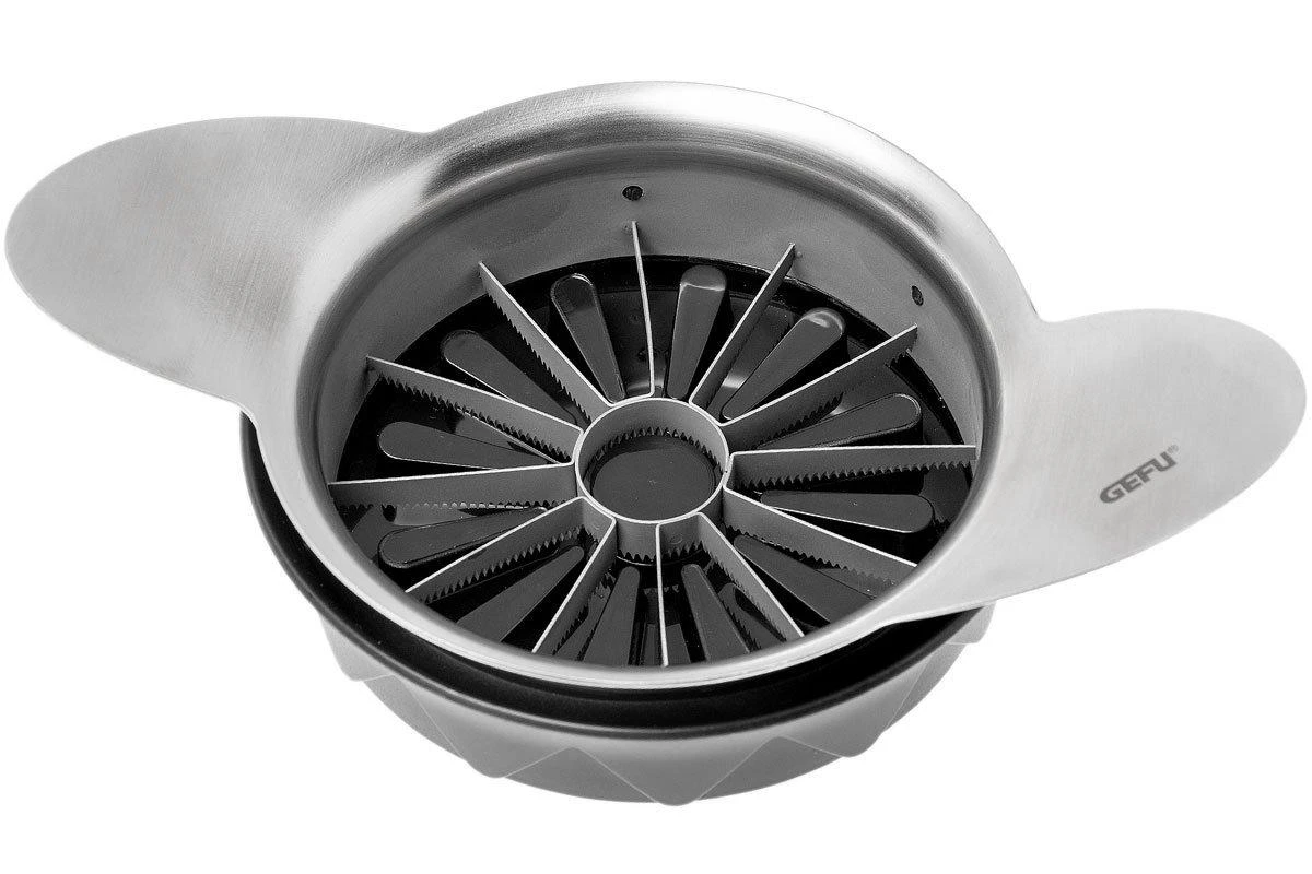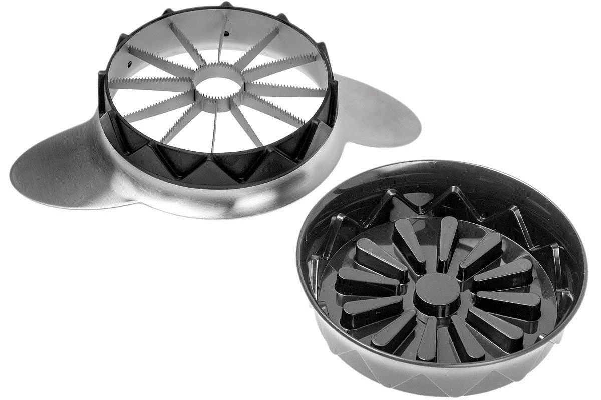 Con el GEFU Pomo puedes cortar fácilmente tomates o manzanas en doce trozos uniformes. La guía de corte automática te ayudará a obtener trozos agradables y uniformes. La hoja es afilada, dentada y de acero inoxidable. Coloca el cortador sobre el producto y empuja las hojas hacia abajo utilizando los mangos. Sin mucho esfuerzo se cortará el producto. La superficie de corte es de acero inoxidable. Es sostenible y puede disfrutarse durante años, incluso después de usarlo con frecuencia. Para evitar que se derrame el zumo, éste queda atrapado en la base de corte. La base es de plástico. Sin embargo, ambas partes pueden lavarse simplemente a mano o en el lavavajillas. El GEFU Pomo no sólo es ideal para las manzanas y los tomates, sino también para las peras, las piñas y otros tipos de fruta. Ideal para hacer ensaladas de frutas o como guarnición de un pastel.
