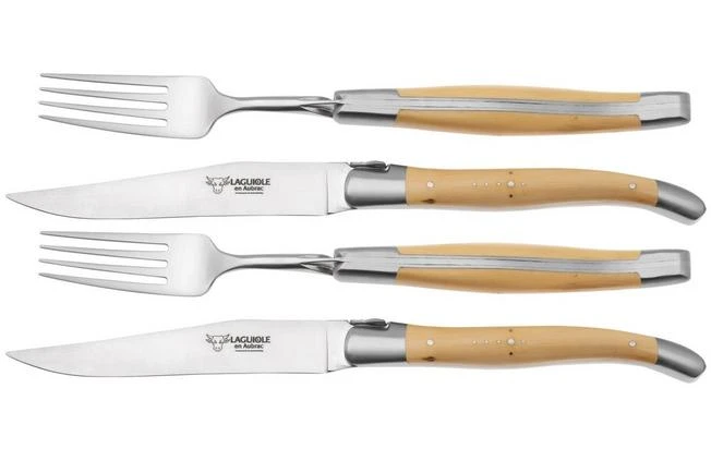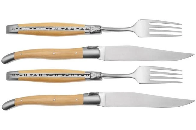 El juego de cubiertos Laguiole en Aubrac de madera de boj es un juego elegante compuesto por dos cuchillos y dos tenedores para carne. Los mangos son de madera de boj. Este juego de cubiertos de la auténtica marca Laguiole será el complemento perfecto para cualquier mesa. Este juego se presenta en una caja de almacenamiento de roble con imanes.
