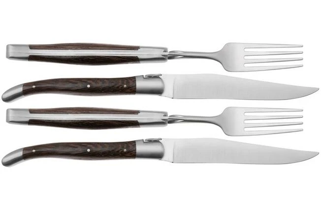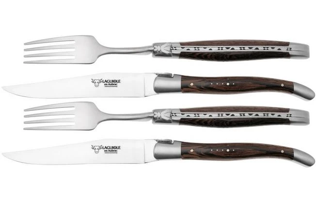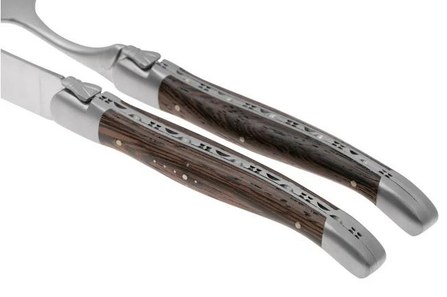 El juego de cubiertos Laguiole en Aubrac de madera de wengué es un juego elegante compuesto por dos cuchillos y dos tenedores para carne. Los mangos son de madera de wengué. Este juego de cubiertos de la auténtica marca Laguiole será el complemento perfecto para cualquier mesa. Este juego viene en una caja de almacenamiento de madera de roble.