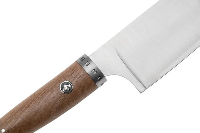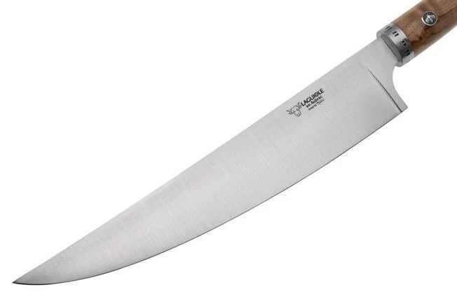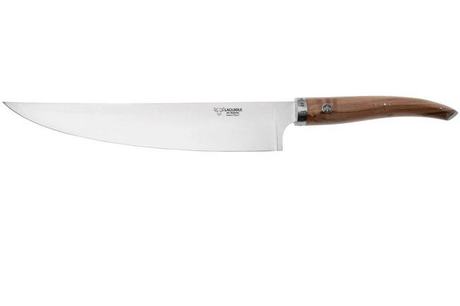 El cuchillo de chef Laguiole en Aubrac Gourmet madera de nogal 25 cm es un cuchillo de cocina artesanal de gran tamaño, elegante y versátil. Destacan la gran «»barriga»» y la punta puntiaguda. Gracias a esta forma, hay mucho filo con el que trabajar. El filo estrecho hacia la punta es perfecto para las tareas más detalladas. Este cuchillo fue fabricado a mano en Espalion, Francia.