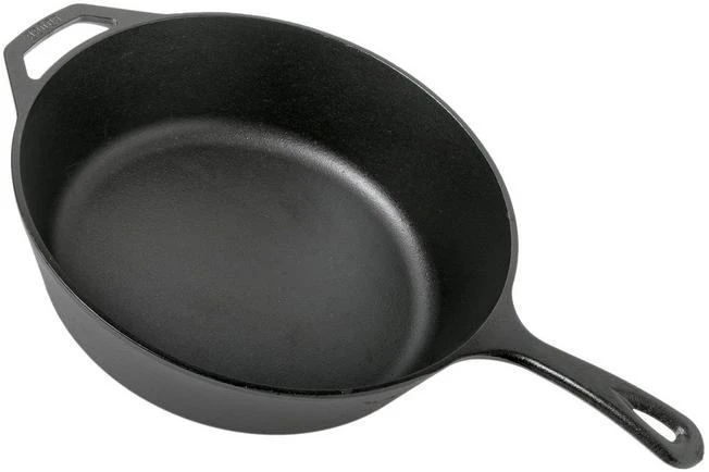 Esta sartén profunda de hierro fundido Lodge Classic tiene el aspecto clásico de una sartén de hierro fundido, pero es ligeramente más profunda. Es ideal para hornear, freír, guisar o asar. El hierro fundido retiene bien el calor y lo distribuye perfectamente. ¡No hay puntos extraños en la sartén donde tu comida no se calienta! Y la sartén se puede utilizar en todas las placas de cocción. Ponla en el horno, o en tu estufa, o cuélgala sobre una llama abierta. Incluso funciona con inducción. Esta sartén está mejorada con un mango fácil de sujetar y un mango plano para asegurarse de que puedes levantarla con facilidad. Estos mangos se calientan, así que asegúrate siempre de agarrar la sartén con un guante de horno o sujeta sartenes de silicona.