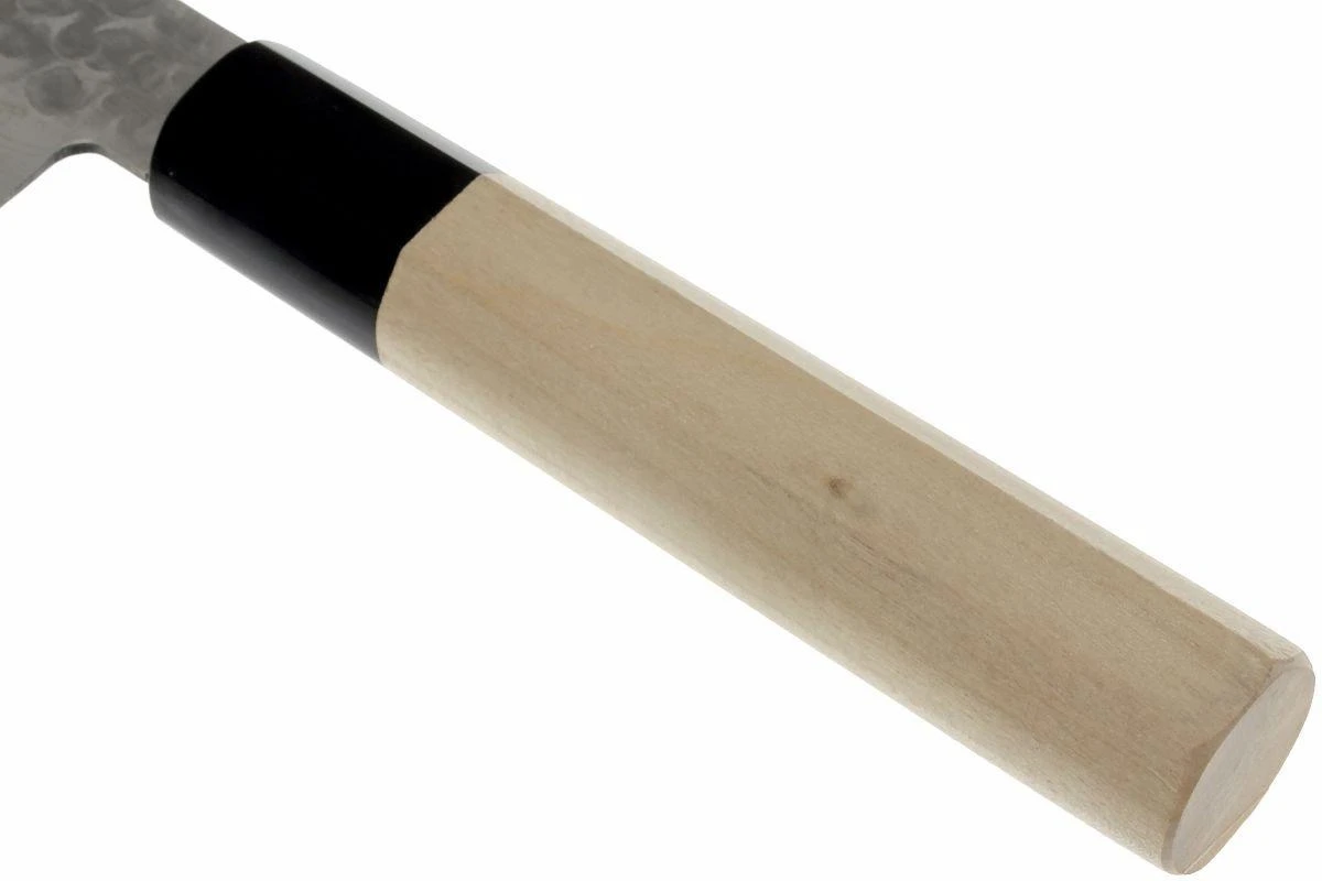 El cuchillo santoku de la colección Damasco de 45 capas de Sakai Takayuki. Este cuchillo de chef, también llamado gyuto, es el más pequeño de los tres cuchillos de chef de la colección.