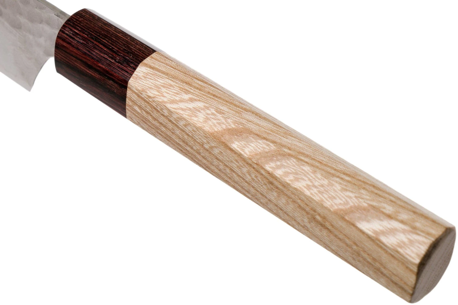 El cuchillo Sakai Takayuki bunka 16 cm de la colección VG10 Damasco Hammered WA de 33 capas está mejorado con una hoja kengata. Significa ‘parecido a una espada’ y se refiere a la forma de la hoja que se inclina bruscamente en la punta. Aparte de eso, el cuchillo puede considerarse un miembro de la familia santoku. Con la punta estrecha puedes cortar finamente carne, pescado y verduras.