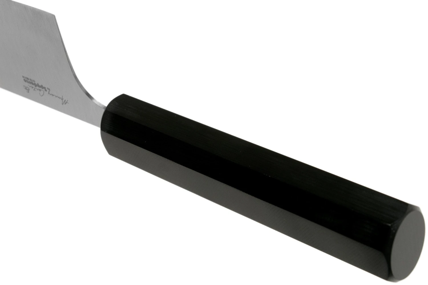 Este cuchillo Spyderco Nakiri de la Colección Murray Carter Wakiita es de una belleza impresionante. Nakiri significa «cortador de verduras». Su forma única y rectangular hace que este cuchillo sea perfecto para cortar todo tipo de verduras. La punta del cuchillo es ligeramente redondeada para asegurarte que también puede cortar rápidamente verduras en ángulo. Además, podrás cortar hierbas en porciones minúsculas con gran facilidad.