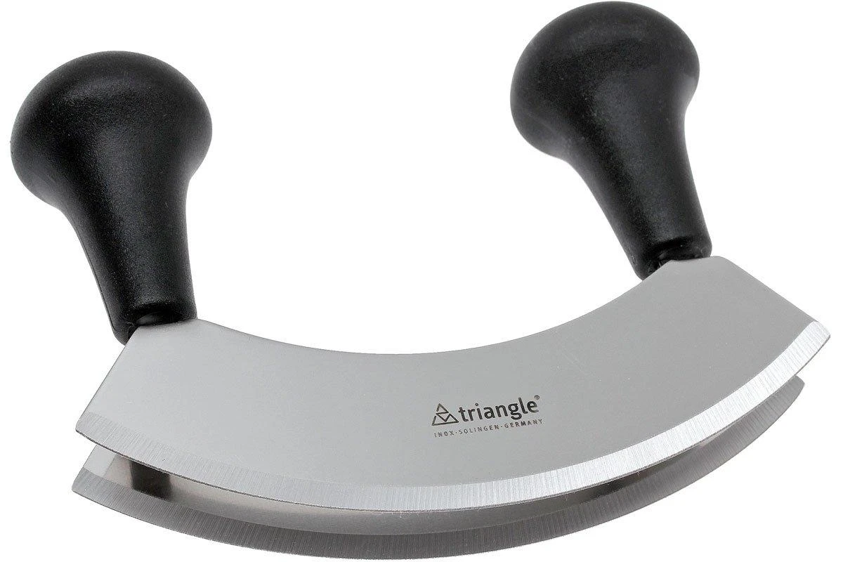 El picador de hierbas Triangle te ayuda a picar tus hierbas, ajos y cebollas muy finamente. Tiene dos hojas en forma de luna que son paralelas entre sí. La hoja curvada ayuda a que ruede sobre la tabla de cortar con facilidad. Las hojas son de acero inoxidable y se afilan a mano. La ventaja de un picador con dos hojas es que la velocidad aumenta considerablemente. También ayuda a cortar mucho más fino en comparación con una sola hoja.