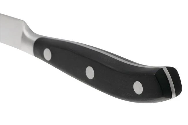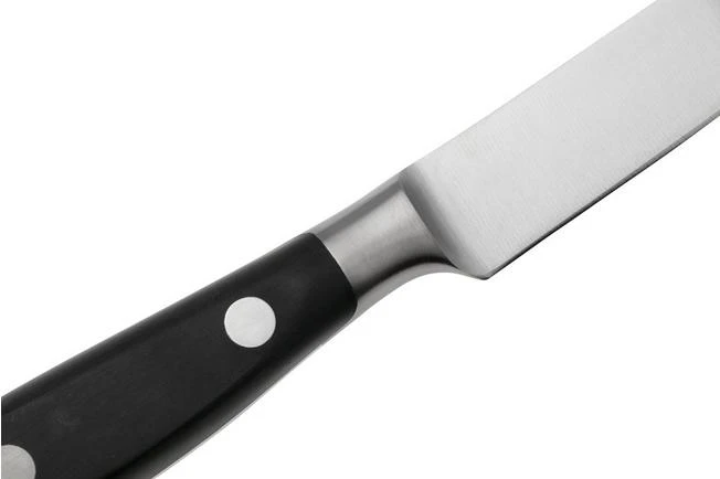 Los cuchillos de cocina Victorinox Grand Maître son robustos y cómodos de usar. Al igual que las mundialmente conocidas navajas Victorinox, los cuchillos de cocina se fabrican prestando gran atención a los detalles. El mango de POM está perfectamente unido a la virola forjada, y los remaches le dan a los cuchillos un aspecto clásico. Los mangos son relativamente grandes, por lo que también son adecuados para personas con manos grandes. Dado que la virola no se extiende hasta el filo del cuchillo, se puede utilizar toda la superficie de corte de la hoja, lo que también facilita el afilado.
