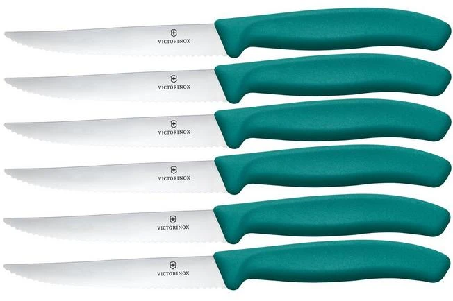 El set de 6 cuchillos dentados para carneVictorinox Swiss Classic Steak & Pizza Knife 6.7234.6C1 Wavy, Green es un práctico set cuchillos que también es ideal para cortar pizza. Los mangos verdes le dan un toque de color a tu mesa.