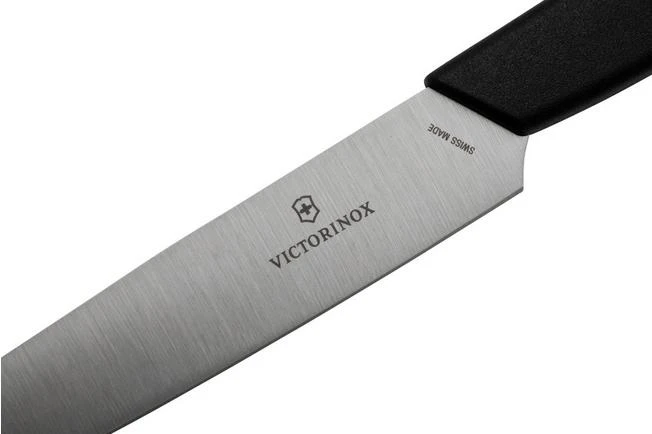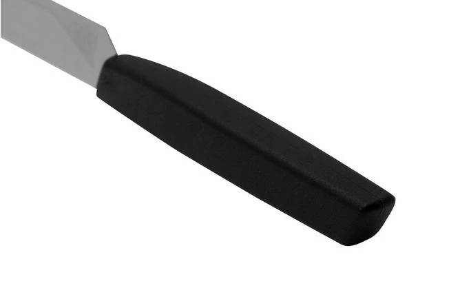 El cuchillo para carne Victorinox Swiss Modern negro es un cuchillo para carne ligero y práctico con un aspecto moderno. Este cuchillo de carne no tiene estrías para asegurarse de que corta la carne sin desgarrarla. Como resultado, la carne se mantiene jugosa. Además, el cuchillo es apto para muchos más usos. Por ejemplo, también es ideal para cortar queso, salchichas y sándwiches.