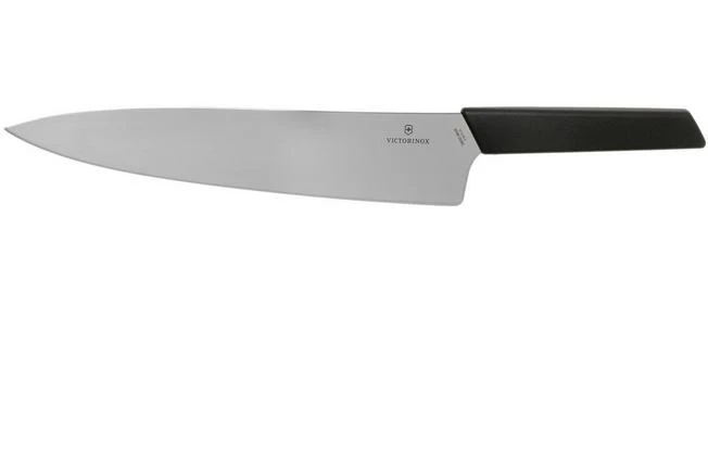 Este cuchillo para trinchar Victorinox Swiss Modern está mejorado con una hoja de 25 cm de largo, que es mucho más larga que la hoja del cuchillo para trinchar promedio. Como tal, es perfecta para cortar piezas de carne más grandes. Gracias a su longitud, puedes realizar movimientos de corte largos y rectos. Cuando cortes, utiliza toda la longitud de la hoja y corta de una sola vez. Nota: sólo debes utilizar un cuchillo para trinchar para cortar la carne. No golpees accidentalmente los huesos. Esto podría hacer que el cuchillo se astillara.