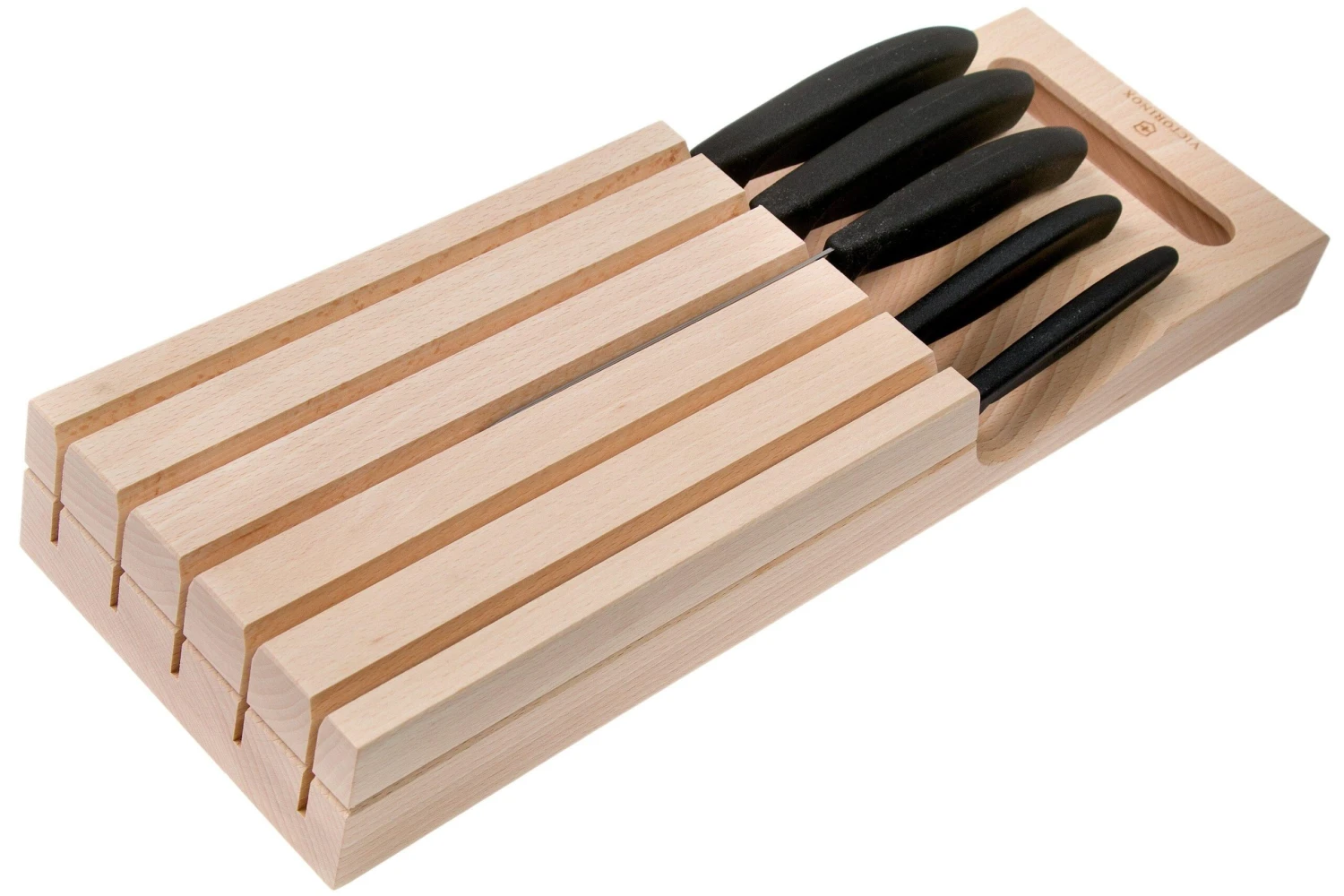 Este Juego de cuchillos Victorinox SwissClassic de 6 piezas con organizador en el cajón se compone de un cuchillo de pan, un cuchillo para trinchar, un santoku con hoja de hoyuelos, un cuchillo tomatero y un cuchillo para verduras. Todo ello se entrega en un práctico organizador de cuchillos dentro del cajón que mide 43 centímetros de largo y 14,5 centímetros de ancho.