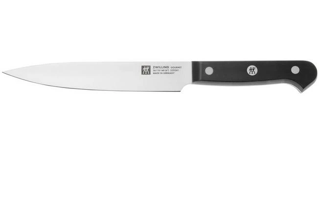El cuchillo para trinchar Zwilling Gourmet, 16 cm es perfecto para cortar carne. Tanto si quieres cortarla en tiras, en rodajas o en simples trozos: este cuchillo te tiene cubierto. La hoja de 16 cm de longitud es relativamente corta para un cuchillo de trinchar. De este modo, el cuchillo es un poco más ligero y fácil de controlar mientras lo utilizas. El cuchillo forma parte de la colección Zwilling Gourmet. Una amplia colección de cuchillos de cocina con un diseño clásico de tres remaches.